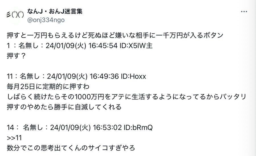 누르면 만엔 받을 수 있지만 미친듯이 싫어하는 상대한테 천만엔이 가는 버튼이 있으면 누를래?